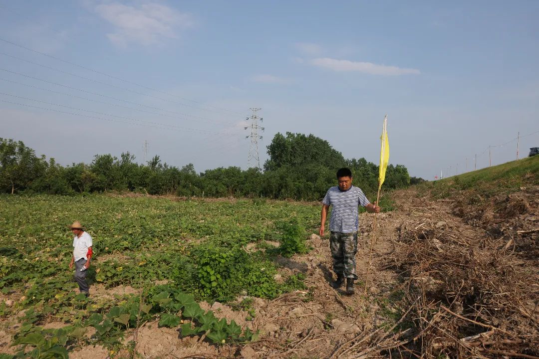“大家沿大堤坡面散开,从这头开始拉网式巡查。”6月30日,主汛期上堤坝的第一天,田野就带着的同事们巡堤。在清基扫障过后剩下光秃秃草杆尖尖的堤面上,34岁的田野一边往前走,双眼不停地扫视着大堤,时不时就要停下来,用力踩踩脚下的泥土,看看是否有渗水的现象。烈日炙烤下,脚上穿的劳保鞋踩在石头上都有些发烫,身上穿的军装也一点点被汗水浸透。“不怕烈日当头晒,就怕碰到下大雨,我们半夜都得穿着雨衣,打着手电筒来巡堤。雨水顺着脖子往里灌不说,脚下打滑、崴脚都是常有的事。”田野说道。在这场防汛保卫战中,田野既是指挥员又是战斗员,他带领大家清障、排查、巡逻、抢险,日夜坚守。