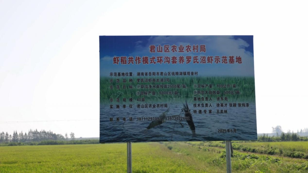 该示范试验项目由君山区农业农村局牵头实施,作为2025年基层农技推广体系改革与建设任务的重要内容,示范基地面积40亩,环沟水面4亩,投放“南太湖3号”罗氏沼虾苗种密度为每亩2500尾,目标产量为100公斤/亩,预计每亩产值可达6000元,大田综合效益有望提升500元/亩。